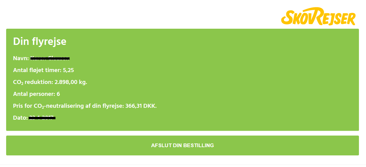 I kan herunder se et konkret eksempel, hvor en rejse for 6 personer, som skal flyve i 5,25 timer, kan CO2-neutralisere rejsen for 366,31 kr.
