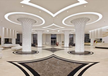 Opened in 2012, the air-conditioned hotel comprises a main building and several 3-storey annexes with a total of 380 rooms. The area includes lobby, reception (24 hours open), safety box, lobby bar, hairdresser, 7 lifts, mini market, shop, 5 bars as well as WIFI (extra charge) and internet corner. Furthermore, several restaurants (a-la-carte) with a terrace and air conditioning and a snack bar as well as an indoor swimming pool.